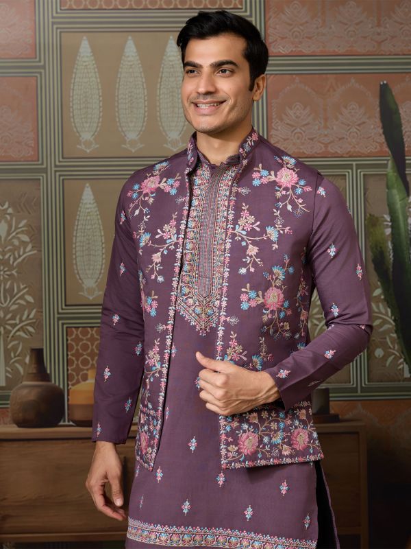 Lavendar Purple Mens Kurta Pyjama With Jacket