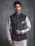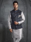 Radiate confidence and poise adorning in this grey color kurta set designed in jacquard silk. Augmented with weaving. Comes with a grey color pant in art silk and a black color upper jacket with cut sleeeves made in jacquard. Note: Some color variations may occur owing to photography causes. Up to 1 inch of measurement fluctuation is possible.