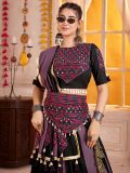 Effortlessly slay the day as you wear this multicolor festive lehenga made in viscose cotton. Augmented with mirror work enhanced and thread embroidered work. Paired with a matching black color embroidered choli a embroidered waist belt with a purple and black color dupatta, both made in viscose cotton. Note: The accessories featured are purely for fashion purposes. Due to photography reasons, some color variations may occur. The semi-stitched choli and lehenga waist may be customized up to 42 inches.