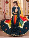Show your feminine side to the world wearing this multicolor designer lehenga made in viscose cotton. Augmented with mirror work and floral thread embroidered work. Available with a matching blue color full sleeved embroidered choli and a blue color dupatta, both made in viscose cotton. Note: The accessories featured are purely for fashion purposes. Due to photography reasons, some color variations may occur. The semi-stitched choli and lehenga waist may be customized up to 42 inches.