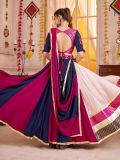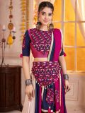 Embrace your ethnic self as you wear this multicolor festive lehenga made in viscose cotton. Furnished with mirror work enhanced and thread embroidered work. Available with a matching navy blue color embroidered choli and a embroidered waist belt with a navy blue and pink color dupatta, both made in viscose cotton. Note: The accessories featured are purely for fashion purposes. Due to photography reasons, some color variations may occur. The semi-stitched choli and lehenga waist may be customized up to 42 inches.