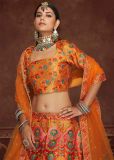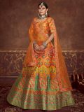 Grace up the whole ambiance wearing this multicolor festive lehenga in art silk. Decorated with floral themed prints all over and intricate zari, thread, embroidered work. Paired with a matching orange color choli in art silk and an orange laced net dupatta, both embellished in similar work. Please keep in mind that the accessories featured are purely for fashion purposes. Due to photography reasons, some color variations may occur. The semi-stitched choli and lehenga waist may be customized up to 42 inches.