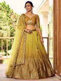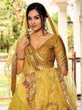 Create symbol of timeless grace and elegance in this mustard yellow color pleated pattern lehenga in chinon. Elevated with heavy sequins with zari work embroidery with shaded print on lehenga. Comes with a matching yellow color embroidered choli in chinon and yellow color dupatta, made in net. Note: The accessories featured are purely for fashion purposes. Due to photography reasons, some color variations may occur. The semi-stitched choli and lehenga waist may be customized up to 42 inches.