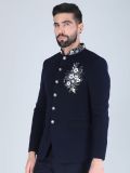 Take your fashion game one level higher by adorning this navy blue color jodhpuri suit made in polyster cotoon fabric. Crafted with sequins work and hand work enhanced with floral work embellishment. Paired with a matching navy blue color pant made in cotton. Note: Some color variations may occur owing to photography causes. Up to 1 inch of measurement fluctuation is possible.