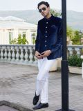 Exude major regal vibes adorning this navy blue color jodhpuri suit made in plain velvet. Note: Some color variations may occur owing to photography causes. Up to 1 inch of measurement fluctuation is possible.