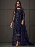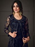 Overwhelm the audience adorning this denim navy blue color jacket style slitted kameez in net. Crafted using sequins and dori work embroidery all over. Teamed with a blue embroidered dupatta in net and matching pants in satin. Note: Accessories shown are for styling purpose only. Slight color variation may occur due to photographic reasons. The semi-stitched kameez can be customised upto 42 inches.