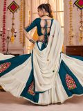 Be the epitome of grace wearing this off white and teal blue color designer lehenga in viscose cotton. Decorated with mirror work and thread work embroidered work. Available with a matching teal blue color embroidered choli and a off white color dupatta, both made in viscose cotton. Note: The accessories featured are purely for fashion purposes. Due to photography reasons, some color variations may occur. The semi-stitched choli and lehenga waist may be customized up to 42 inches.