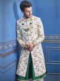 Look a class apart on any celebration adorning this Off White Colour Silk Fabric Men's Sherwani With Thread,Zari,Zardozi Work.