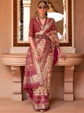 Get set to look regal wearing this off-white color saree crafted in silk. Furnished with dense patola print and showcasing woven distinctive borders. Teamed with a matching maroon printed blouse in silk. Note: The accessories featured are purely for fashion purposes. Due to photography reasons, some color variations may occur. The un-stitched blouse may be customized up to 42 inches.