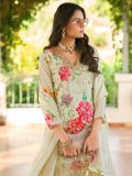Addressing the Glamour while having this off white color straight cut kameez made in chinon silk. Crafted using sequins and zari work embellishment with digital printed pattern all over. Comes with a matching off white color printed palazzo style bottom and a off white color dupatta, both made in chinon silk. Note: Accessories shown are for styling purpose only. Slight color variation may occur due to photographic reasons. The semi-stitched kameez can be customised upto 42 inches.