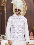 Walk the glam wearing this off white color kurta designed in art silk. Enhanced with sequins and digital printed pattern all over work. Comes with a off white color churidaar in art silk and a printed nehru jacket in satin. Note: Some color variations may occur owing to photography causes. Up to 1 inch of measurement fluctuation is possible.