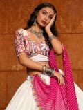 Wrap yourself in culture wearing this off white color designer lehenga crafted in crepe. Crafted with mirror work enhanced with floral thread work. Paired with a matching off white color embroidered choli in crepe and a pink color bandhej printed dupatta, made in georgette. Note: The accessories featured are purely for fashion purposes. Due to photography reasons, some color variations may occur. The semi-stitched choli and lehenga waist may be customized up to 42 inches.