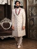Elevate your D-day look with this off-white color sherwani made in silk. Designed using thread, zari embroidery with stones embellishment work. Teamed with off-white color churidaar in silk. Note: Some color variations may occur owing to photography causes. Up to 1 inch of measurement fluctuation is possible.