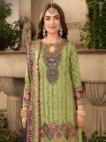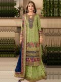 Give a glamorous glance wearing this olive green color straight cut kameez in georgette. Designed using sequins, stone and zari with thread embroidery in gota patti embellishments. Paired with a dark blue color dupatta in heavy embroidery and lehenga style bottom made in green color. Note: Accessories shown are for styling purpose only. Slight color variation may occur due to photographic reasons. The semi-stitched kameez can be customised upto 42 inches.