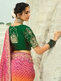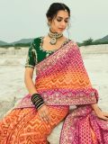 Take your fashion game one level higher by adorning this orange and pink color ombre shaded bridal saree designed in pure georgette. Designed using sequins, stone work and floral thread work enhanced, mirror work embellishment or heavy zari embroidery with floral and bandhej printed patterns, showcasing distinstive heavy embroidered borders and woven pallu with tassels. Available with a dark green color embroidered blouse in silk. Note: The accessories featured are purely for fashion purposes. Due to photography reasons, some color variations may occur. The un-stitched blouse may be customized up to 42 inches.
