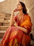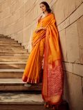 Exude major regal vibes adorning this carrot orange color saree in silk. Decorated using bandhani with patola print enhanced by distinctive woven border and tasseled pallu. Paired with a matching orange color printed blouse in silk. Note: The accessories featured are purely for fashion purposes. Due to photography reasons, some color variations may occur. The un-stitched blouse may be customized up to 42 inches.