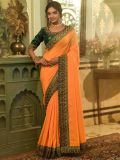 Steal the thunder wearing this orange color saree crafted in georgette. Furnished using thread embroidered work creating distinstive borders. Comes with a contrast matching green color embroidered blouse in georgette. Note: The accessories featured are purely for fashion purposes. Due to photography reasons, some color variations may occur. The un-stitched blouse may be customized up to 42 inches.