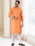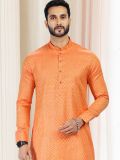 Displaying this orange color kurta made in silk. Furnished with printed patterns with mandarin collar, buttoned placket and full sleeves. Paired with a white color trouser pants in art silk. Note: Some color variations may occur owing to photography causes. Up to 1 inch of measurement fluctuation is possible.
