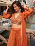 Spreading the sparking vibes with this orange color full sleeved top made in banglori silk. Enhanced with mirror work and zari embellishment work with floral thread embroidery all over. Comes with matching orange color palazzo style bottom made in jacquard and a orange color dupatta in net. Note: Some color variations may occur owing to photography causes. Up to 1 inch of measurement fluctuation is possible.