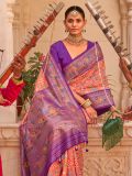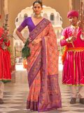 Turn your playful mode on adorning this orange color saree crafted in art silk. Elevated using paithani prints and zari woven distinstive borders and pallu. Available with a matching purple color blouse in art silk. Note: The accessories featured are purely for fashion purposes. Due to photography reasons, some color variations may occur. The un-stitched blouse may be customized up to 42 inches.
