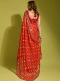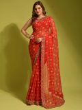 Walk the glam adorning this orange color saree crafted in organza. Augmented using sequins and thread embroidered patterns, showcasing distinstive border. Available with a matching orange color blouse in art silk. Note: The accessories featured are purely for fashion purposes. Due to photography reasons, some color variations may occur. The un-stitched blouse may be customized up to 42 inches.