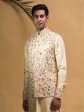 Reflect the strength of your fashion as you stand in this adorning this cream color kurta designed in silk. Augmented with stone and floral thread embroidery. Paired with a nehru jacket with floral embroidery and a cream color pant in art silk. Note: Some color variations may occur owing to photography causes. Up to 1 inch of measurement fluctuation is possible.