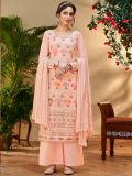 Win all hearts with this bright peach color straight cut kameez in georgette. Elevated using sequins and thread embroidery all over. Comes with a matching chiffon dupatta and a matching bottom in shantoon. Note: Accessories shown are for styling purpose only. Slight color variation may occur due to photographic reasons. The semi-stitched kameez can be customised upto 42 inches.
