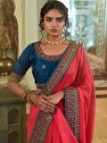 Get all dolled up wearing this peach color saree crafted in georgette. Elevated using thread embroidered work creating distinstive borders. Available with a contrast matching blue color embroidered blouse in georgette. Note: The accessories featured are purely for fashion purposes. Due to photography reasons, some color variations may occur. The un-stitched blouse may be customized up to 42 inches.