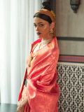 Shine bright like a diva as you wear this lush peach color saree crafted in silk. Furnished using zari woven patterns, showcasing tasseled pallu. Comes with a matching peach color blouse in silk. Note: The accessories featured are purely for fashion purposes. Due to photography reasons, some color variations may occur. The un-stitched blouse may be customized up to 42 inches.