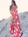 Slay with the playful aura of this sweet peach saree crafted in satin. Enhanced using floral digital printed patterns all over. Comes with a matching blouse in satin. Note: The accessories featured are purely for fashion purposes. Due to photography reasons, some color variations may occur. The un-stitched blouse may be customized up to 42 inches.