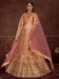 Allure the eyes to you wearing this peach color festive lehenga in art silk. Decorated with floral themed prints all over and intricate zari, thread, embroidered work. Paired with a matching peach color choli in art silk and a peach laced net dupatta, both embellished in similar work. Please keep in mind that the accessories featured are purely for fashion purposes. Due to photography reasons, some color variations may occur. The semi-stitched choli and lehenga waist may be customized up to 42 inches.