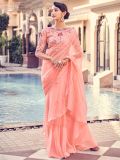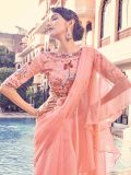 Spread a soothing aura as you wear this peach color saree crafted in organza. Designed using ruffle patterns. Comes with a matching peach color organza blouse enhanced with thread embroidered work. Note: The accessories featured are purely for fashion purposes. Due to photography reasons, some color variations may occur. The un-stitched blouse may be customized up to 42 inches.