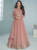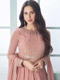 Get your hands on this peach color floor-length anarkali kameez in georgette. Augmented using sequins and thread embroidery all over. Teamed with a matching georgette dupatta and a matching bottom in shantoon. Note: Accessories shown are for styling purpose only. Slight color variation may occur due to photographic reasons. The semi-stitched kameez can be customised upto 42 inches.