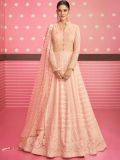 Presenting this peach color anarkali suit in georgette. Designed using thread and sequins embroidery all over. Comes with a matching embroidered georgette dupatta and a pair of bottom. Note: Accessories shown are for styling purpose only. Slight color variation may occur due to photographic reasons. The semi-stitched kameez can be customised upto 42 inches.