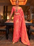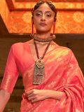 Keep shinning all day as you wear this lush peach color saree crafted in silk. Enriched with floral themes zari woven patterns all over with distinstive pallu. Comes with a matching peach color blouse in silk. Note: The accessories featured are purely for fashion purposes. Due to photography reasons, some color variations may occur. The un-stitched blouse may be customized up to 42 inches.