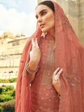Look no less than a dream adorning this rust peach color straight cut kameez in cotton. Designed with thread, zari and sequins embroidery all over. Comes with a matching satin pants and an embroidered dupatta in cotton. Note: Accessories shown are for styling purpose only. Slight color variation may occur due to photographic reasons. The semi-stitched kameez can be customised upto 42 inches.