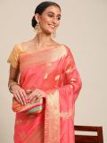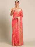 Spread cheer adorning this bright peach color saree crafted in organza. Enhanced using woven patterns, showcasing distinstive borders and pallu. Comes with a matching peach color blouse in organza. Note: The accessories featured are purely for fashion purposes. Due to photography reasons, some color variations may occur. The un-stitched blouse may be customized up to 42 inches.