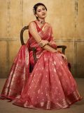 Grace up your aura adorning this peach color saree in tissue. Elevated with dainty zari woven patterns. Comes with a matching woven blouse made in tissue. Note: Accessories shown are for styling purpose only. Slight color variation may occur due to photographic reasons. The un-stitched blouse can be customised upto 42 inches.