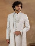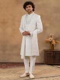 Invigorate your wardrobe by adding this pearl white color sherwani made in silk. Decorated using sequins and stone work with heavy floral thread embellishment all over. Comes with a matching white color pants in art silk and a white color embroidered stole. Note: Some color variations may occur owing to photography causes. Up to 1 inch of measurement fluctuation is possible.