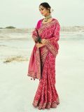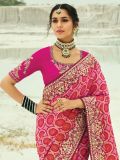 Elegance personified in every folds of this ani pink color bridal saree designed in pure georgette. Augmented using sequins, stone work and floral thread work enhanced, mirror work embellishment or heavy zari embroidery with floral and bandhej printed patterns, showcasing distinstive heavy embroidered borders and woven pallu with tassels. Comes with a pink color embroidered blouse in silk. Note: The accessories featured are purely for fashion purposes. Due to photography reasons, some color variations may occur. The un-stitched blouse may be customized up to 42 inches.