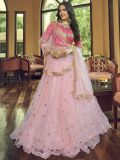 Dazzle the audience wearing this baby pink color designer lehenga in net. Decorated with sequins and thread embroidered work. Available with a matching pink color embroidered choli in art silk and pink net dupatta. Note: The accessories featured are purely for fashion purposes. Due to photography reasons, some color variations may occur. The semi-stitched choli and lehenga waist may be customized up to 42 inches.