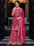 Overwhelm the audience adorning this hot pink color straight cut kameez in crepe. Enhanced using zari and thread work embroidery with sequins all over. Comes with a matching crepe dupatta and an embroidered palazzo in crepe. Note: Accessories shown are for styling purpose only. Slight color variation may occur due to photographic reasons. The semi-stitched kameez can be customised upto 42 inches.