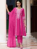 Turn your bling mode on adorning this hot pink color flared kameez in art silk. Augmented using mirror work and thread embroidery all over. Assembled with a pink organza dupatta and matching pants in art silk. Note: Accessories shown are for styling purpose only. Slight color variation may occur due to photographic reasons. The semi-stitched kameez can be customised upto 42 inches.