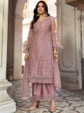 Exude all the festive vibes adorning this mauve pink color straight cut kameez in net. Augmented using fine thread work embroidery with stones all over. Assembled with a matching net dupatta and a matching palazzo in net with satin linings. Note: Accessories shown are for styling purpose only. Slight color variation may occur due to photographic reasons. The semi-stitched kameez can be customised upto 42 inches.