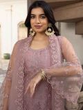 Exude regal finesse in this mauve pink color straight cut kameez made in net. Augmented using stones and dori embroidery all over. Paired with a matching net dupatta and a matching palazzo in net with satin liner. Note: Accessories shown are for styling purpose only. Slight color variation may occur due to photographic reasons. The semi-stitched kameez can be customised upto 42 inches.