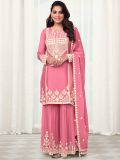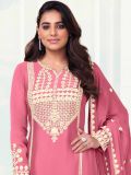 Take your festive look a notch higher with this pink color kameez in chiffon. Augmented using sequins and thread embroidery all over. Comes with a matching chiffon dupatta and chiffon sharara, both enriched with similar embroidery. Note: Accessories shown are for styling purpose only. Slight color variation may occur due to photographic reasons. The semi-stitched kameez can be customised upto 42 inches.