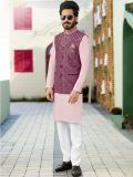 Look lavish adorning this baby pink color kurta made in jacquard. Topped with a magenta velvet nehru jacket enriched with thread embroidered details. Comes with a white color trouser pants in cotton. Note: Some color variations may occur owing to photography causes. Up to 1 inch of measurement fluctuation is possible.