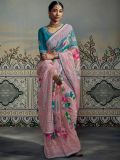 Be the centre of attraction wearing this pink color saree crafted in organza. Enhanced using brasso floral patterns all over. Teamed with an embroidered blue color blouse in organza. Note: The accessories featured are purely for fashion purposes. Due to photography reasons, some color variations may occur. The un-stitched blouse may be customized up to 42 inches.