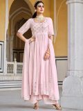 Switch on your bling mode with this baby pink color anarkali kameez in georgette. Designed using sequins and thread, mirror work embroidery all over. Paired with a pink dupatta and a palazzo, both made in georgette. Note: Accessories shown are for styling purpose only. Slight color variation may occur due to photographic reasons. The semi-stitched kameez can be customised upto 42 inches.