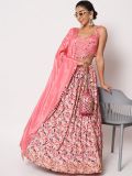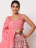 Twirl and dance all night adorning this peach color lehenga in art silk. Crafted using prints with sequins and thread embroidered work. Teamed with a matching pink purple color mirror embellished choli and pink dupatta, both made in art silk. Note: The accessories featured are purely for fashion purposes. Due to photography reasons, some color variations may occur. The semi-stitched choli and lehenga waist may be customized up to 42 inches.